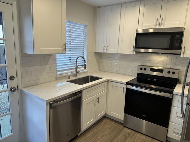 gorgeous remodeled townhome-shows like a new home-end unit, attached on one side only and no one above you-new kitchen cabinets and quartz counters-new hard surface flooring throughout-complete new bathroom upgrade-new mirror closet doors-new lighting fixtures and new ceiling fans-new window coverings-tons of money spent on this remodel-private patio with side gate to outside common area-best location in the complex-your clients will love this property.