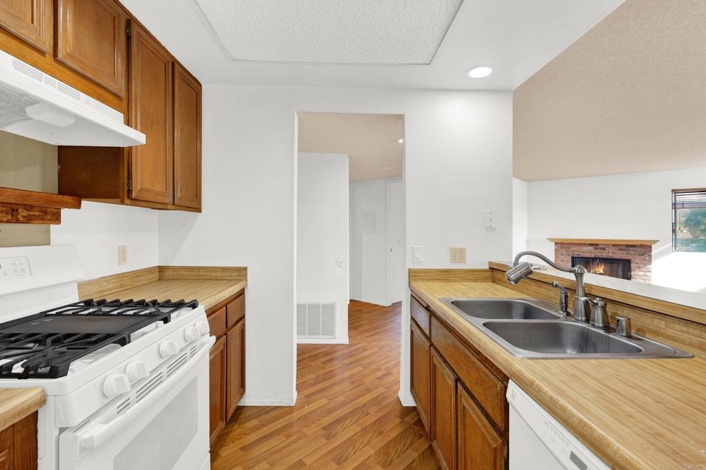 2916 Elm Tree Court is a light & bright 2 bedroom/2 bath condominium with a great floorplan. Street level location with no stairs plus one covered carport space and small storage closet. This unit offers inside laundry with stackable washer and dryer, primary bedroom w/separate bathroom, walk-in closet & sliding door to exterior patio, Galley style kitchen with pantry & breakfast bar, small dining room area with ceiling fan, open style livingroom w/large gas burning fireplace, private patio, laminate flooring & central air. This home is located in a great community that offers two tennis courts, pool, spa, water, sewer, trash, exterior maintenance and lush landscaping. All appliances convey. Ranchwood Park is a Non Smoking complex. Condo needs some TLC which is reflected in the price.