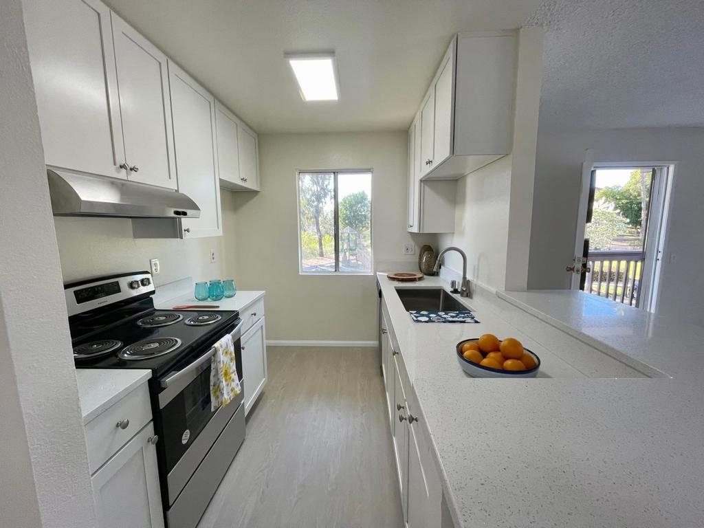 Newly remodeled, light and bright upper 1-level condo with brand-new Shaker kitchen & bath! Sunny kitchen has white quartz counters, new appliances & stainless steel sink. Also features new LVP flooring, single garage, interior laundry, mountain-view balcony & slight ocean view from kitchen! Located in the quiet Bonita Grande community on a cul-de-sac street which includes a grassy private park with a playground. Garage is a 2-car, shared w/ a neighbor. NOTE: Closet doors are on order. Complex Features: , Equipment: Range/Oven Sewer: Sewer Connected Topography: LL